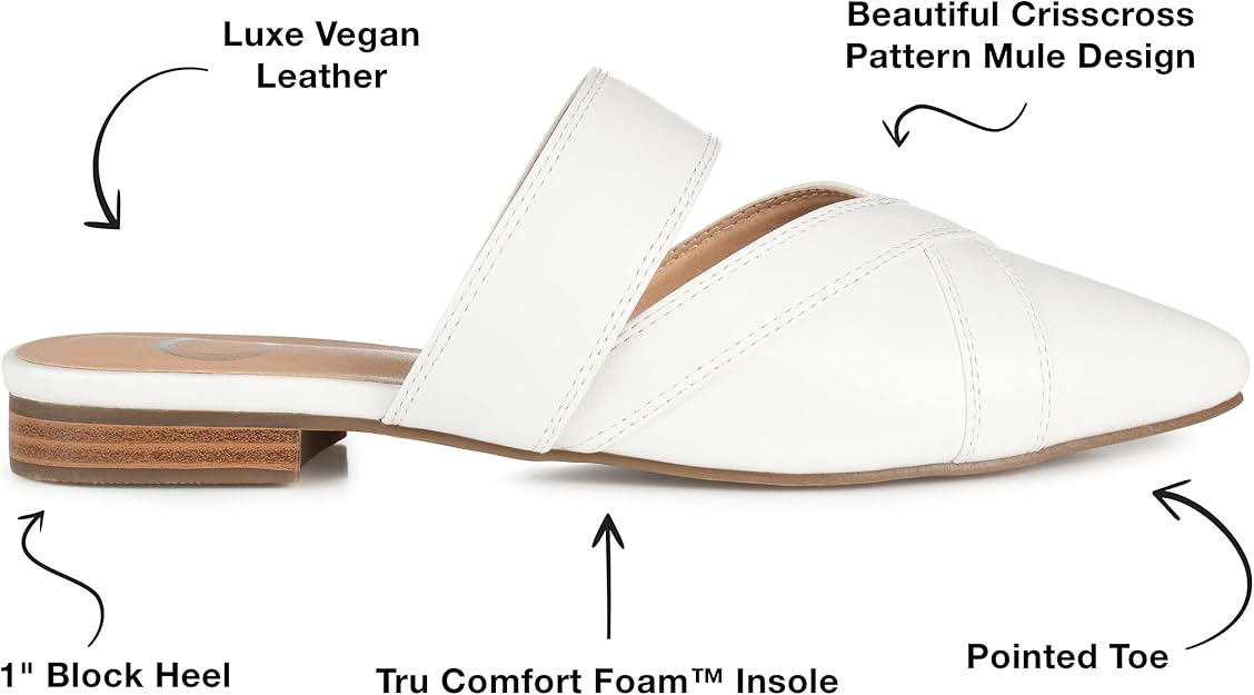 Rock an undying style in the Stasi Mules by Journee Collection. With a tiny block heel and a 4-millimeter Comfort Foam™ footbed, this classic look can be worn all day. Vegan leather uppers detailed with a strap at the vamp and a crisscross accent at the toe finish these slip-on flats.