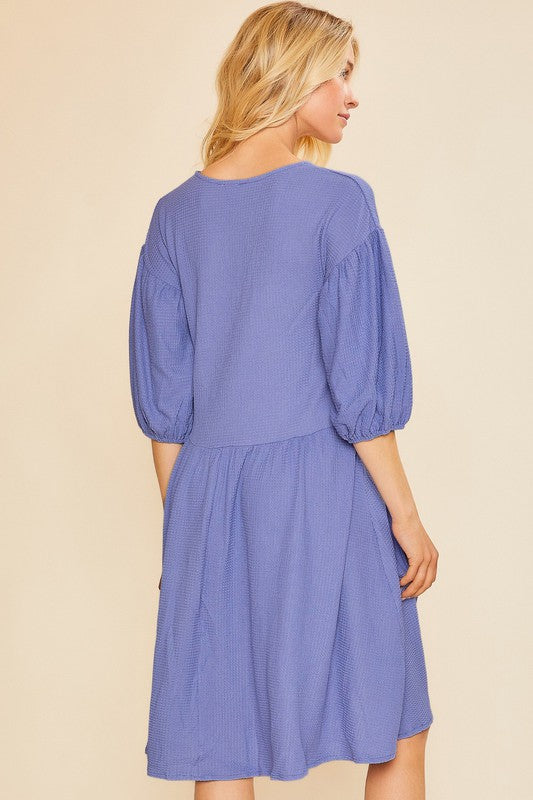 TEXTURED V NECK PUFF SLEEVE KNIT DRESS - periwinkle color - V NECK LINE - PUFF SLEEVES - KNIT DRESS - LOOSE FIT - HALF SLEEVES - KNEE LENGTH